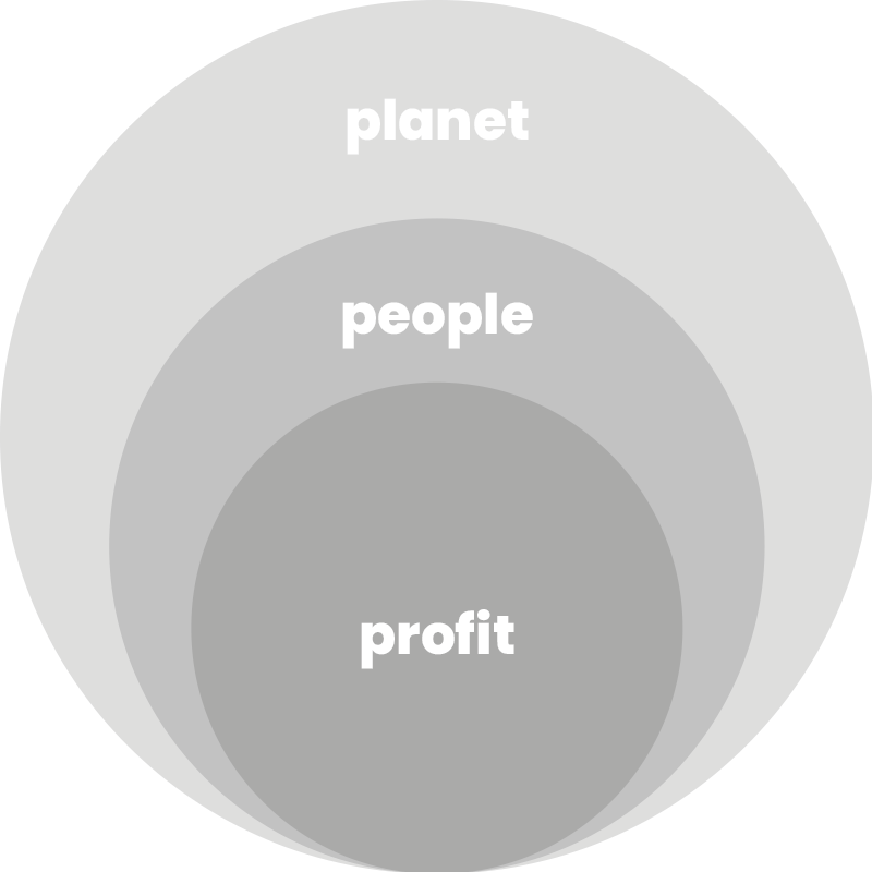 Dabei behalten Unternehmen das Wohl von unserer Erde und unserer Gesellschaft immer im Blick. Oft werden die drei Perspektiven Planet (planet), Gesellschaft (people) und Unternehmen (profit) als drei unabhängige Kreise mit einer kleinen Überschneidung in der Mitte skizziert. Wie halten diese Darstellung nicht mehr für zeitgemäß und sie stellt auch nicht unsere Denkweise dar.